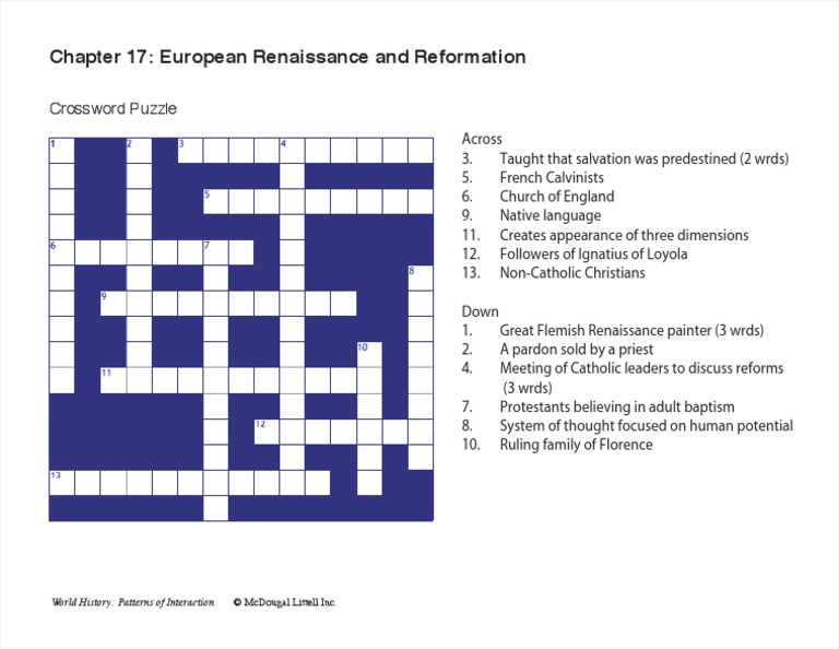 Chapter 1 European Renaissance And Reformation Crossword Puzzle Answers